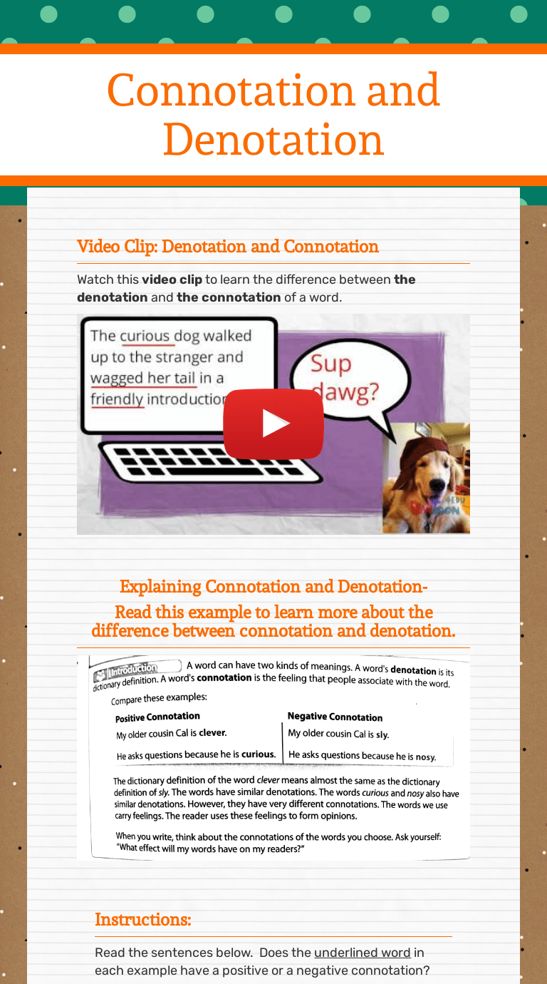 Connotation denotation worksheets 6th grade positive & negative connotationschoose the wordchoose the correct word in parentheses to give each sentence a connotation and denotation worksheet. Connotation online worksheet for sixth grade.